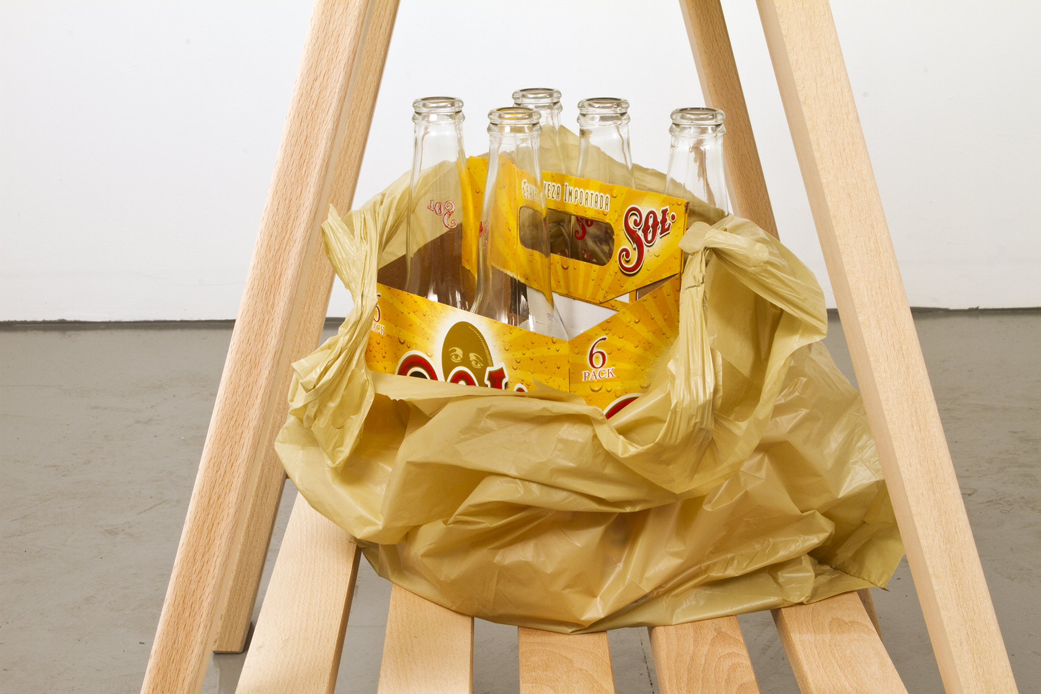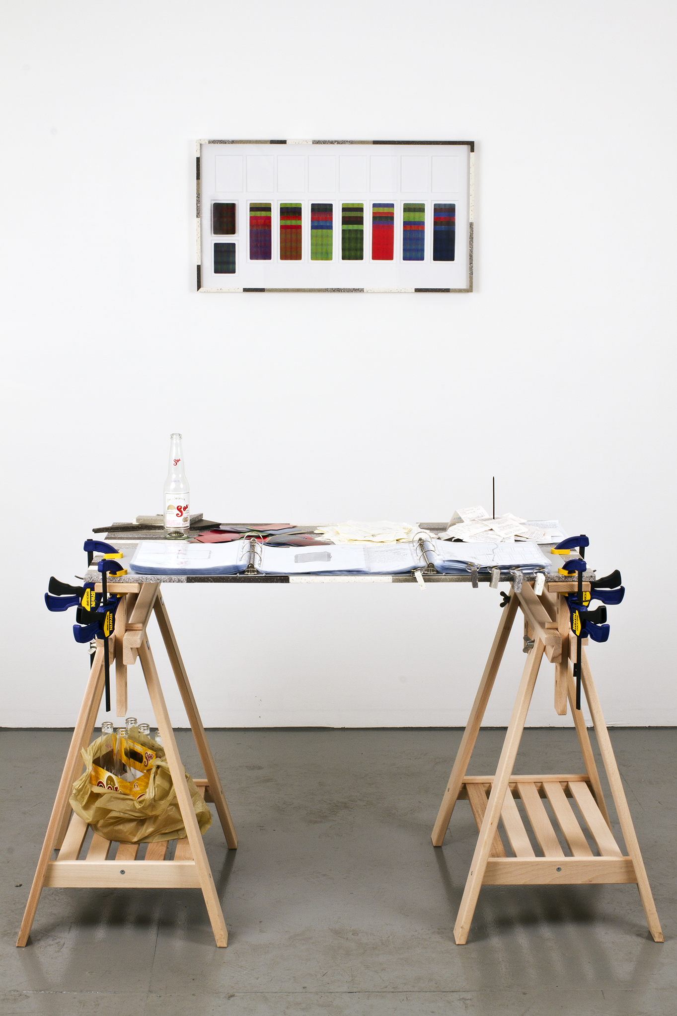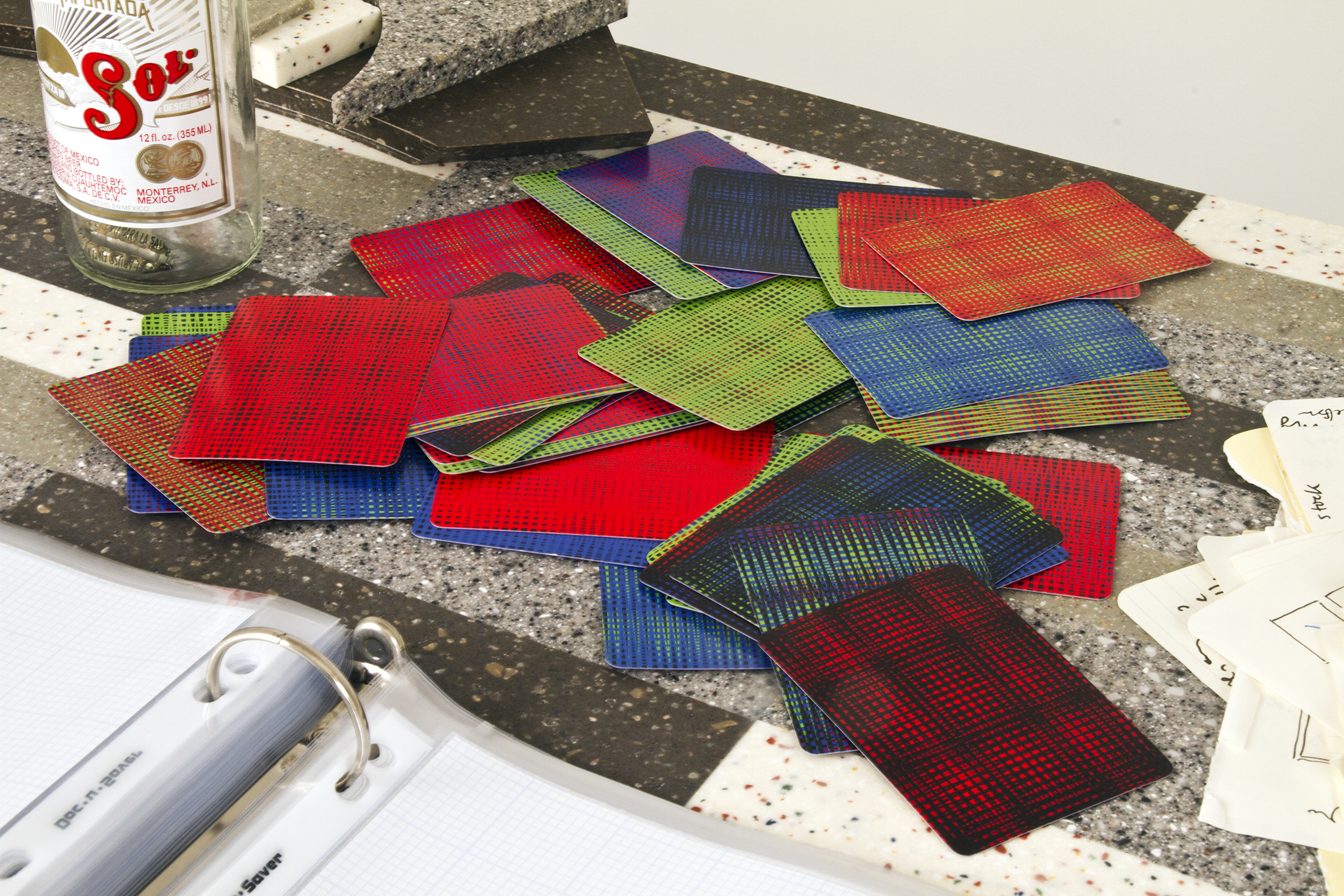 editioned playing cards, varieties of Solid Surface, wood, metal, 104 preparatory drawings, receipts, loose notes, beer bottles, clamps